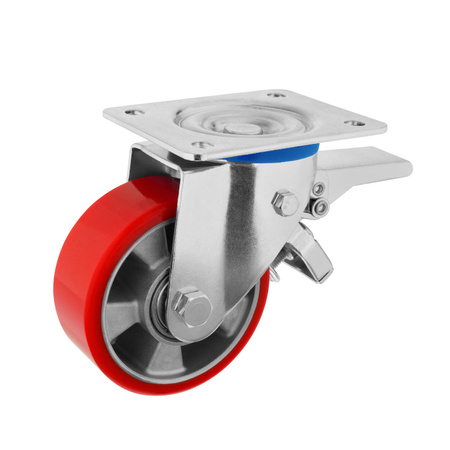 - Zestaw kołowy skrętny z hamulcem o średnicy 160 mm i nośności 350 kg, koło z poliuretanu na aluminiowym rdzeniu.